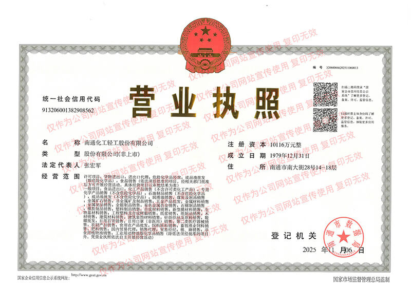 南通化工輕工股份有限公司成立于1963年7月1日, 1997年改制為股份有限公司,注冊資本10116萬元。公司自1963年成立以來,始終堅(jiān)持“誠信為本”的商信文化,向海內(nèi)外廣大供應(yīng)商按時足額履行付款、向廣大客戶按時按質(zhì)按量按價(jià)履行供貨、向金融機(jī)構(gòu)按時足額履行還款等,在商界享有很高聲譽(yù)。